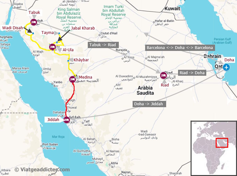 Ruta de 13 dies per l'Aràbia Saudita, visitant les ciutats de Jiddah, Medina i Riad, i recorrent 1.800 km amb cotxe de lloguer des de Medina fins a Tabuk, amb parades a Khàybar, Al-Ula, Tayma i Wadi Disah.