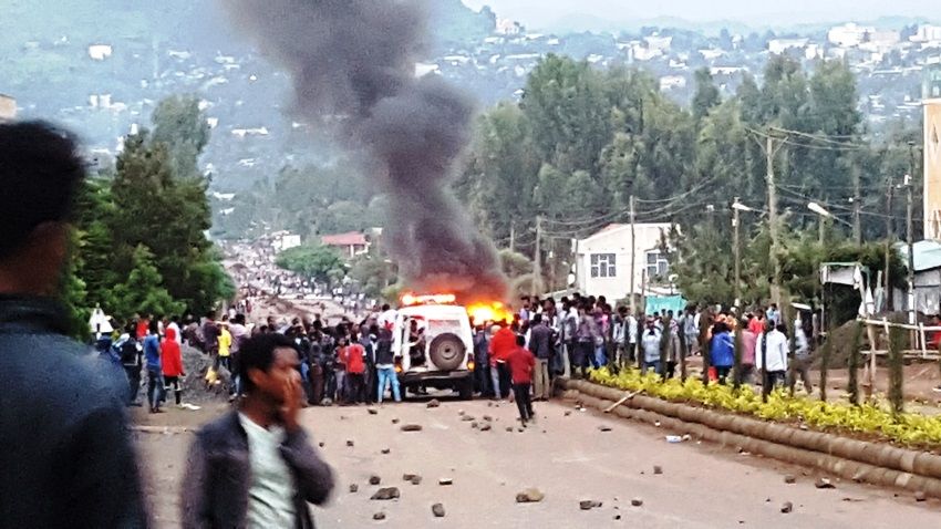 Al volver de Kosoye a Gondar nos encontramos que estaba cortada al tráfico la calle que llevaba a nuestro hotel. Mientras hablábamos con el conductor de lo que ocurría y si era fácil llegar andando vimos que por una de las calles venía una gran cantidad de manifestantes, algunos de ellos con piedras y palos.