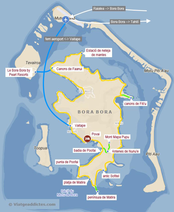 En el vol de Bora Bora a Tahití (veure Les millors vistes des de la finestreta de l'avió) és recomanable seure en el costat dret de l'avió per a veure bé des de l'aire totes les grans illes de la Societat.