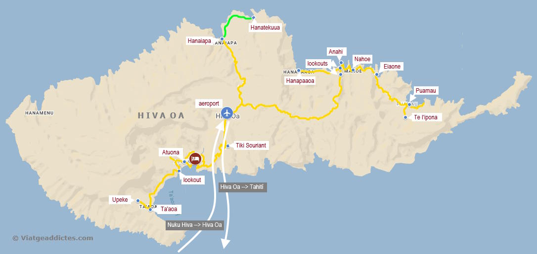 A continuació teniu el nostre itinerari inicialment previst per als quatre dies afectats. Cal tenir en compte que, a causa dels horaris dels vols, no era possible arribar el mateix dia des de Hiva Oa a Mo'orea via Tahití, tot i que hi havia l'opció d'agafar un ferri des del port de Pape'ete fins a la propera illa de Mo'orea aquella mateixa tarda.