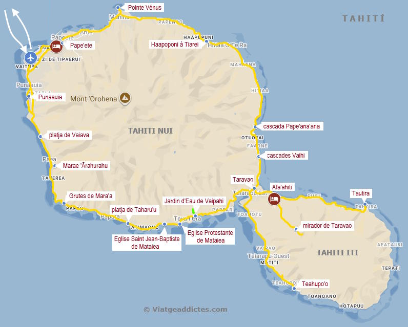 El següent mapa situa els llocs que vam visitar i recórrer en els dies que vam estar a l'illa de Tahití: